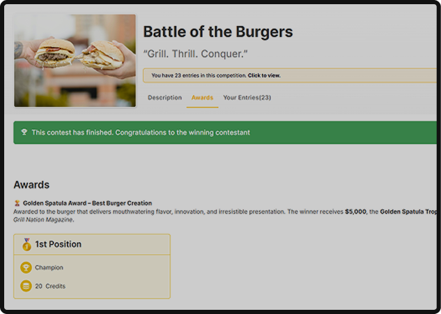 Each competition has its own rewards: cash prizes, trophies, achievements, and bragging rights. Entries are scored by our judges and our guest judge across a range of categories to keep things fair and fun.
